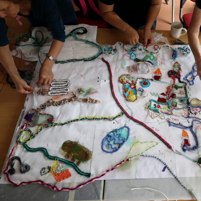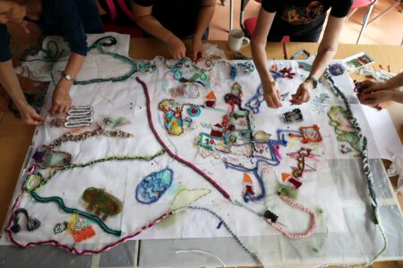 Tissus Urbains propose une plongée sensible au cœur de la ville. Accompagné·es de quatre artistes textiles – Lara Perez Dueñas, Louise Danhaive, Louise Limontas et Valérie Provost – les Bruxellois et Bruxelloises ont réinventé les contours de leur quartier. Loin des tracés habituels, ils et elles ont créé des cartes subjectives : des toiles où se nouent récits intimes, fragments de mémoire et souvenirs rappelés au détour d’une rencontre.
