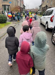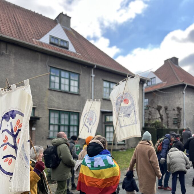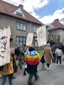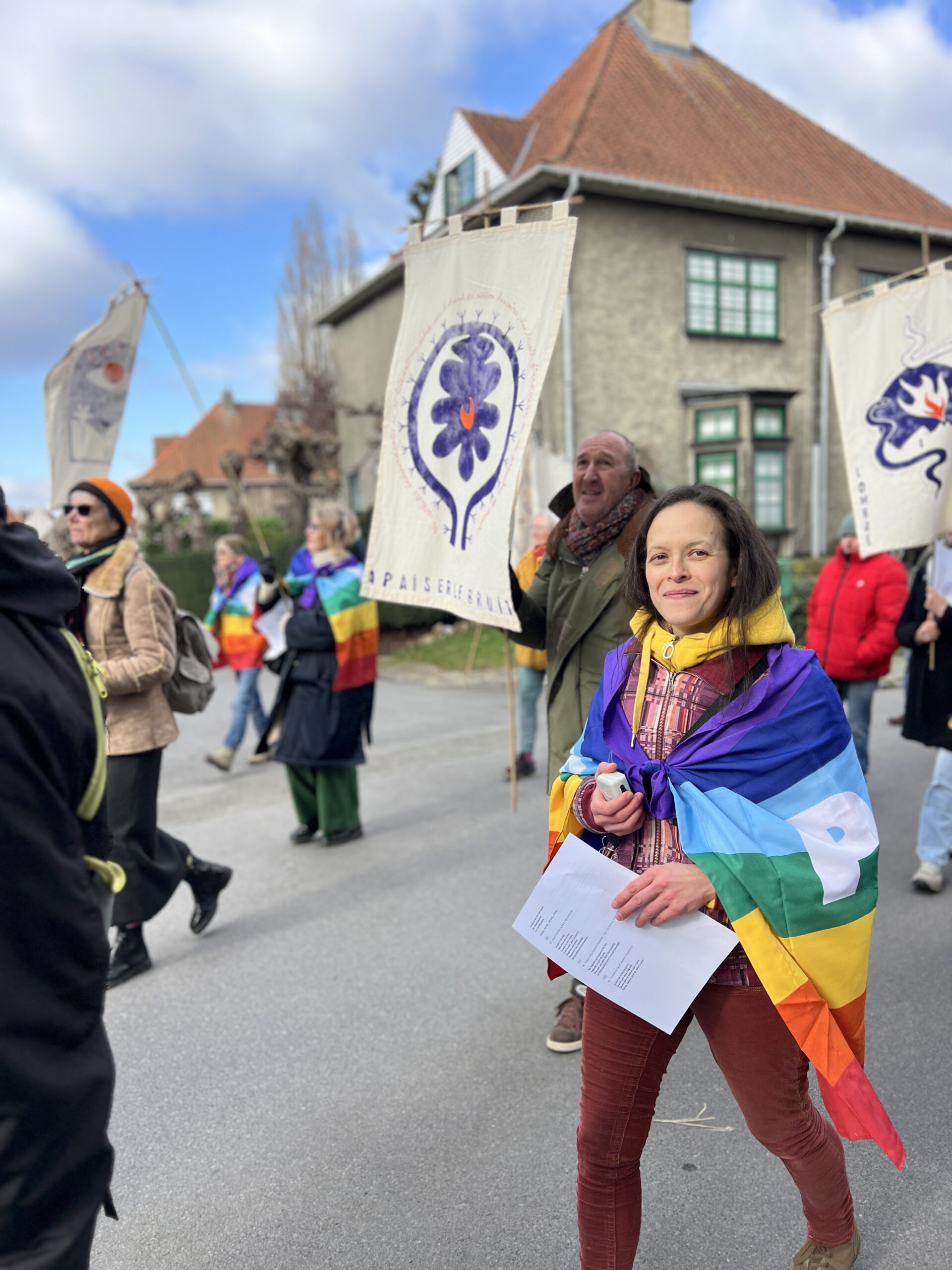 En février 2026, les dalles créées avec les habitant·es s’assemblent pour composer deux trottoirs dans la commune. Ce moment s’accompagne d’une marche avec le Manteau de la paix et les étandards du Manifeste pour une paix enragée. La marche sera guidée par la Fanfare du Coin du balai.
