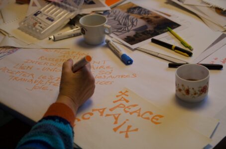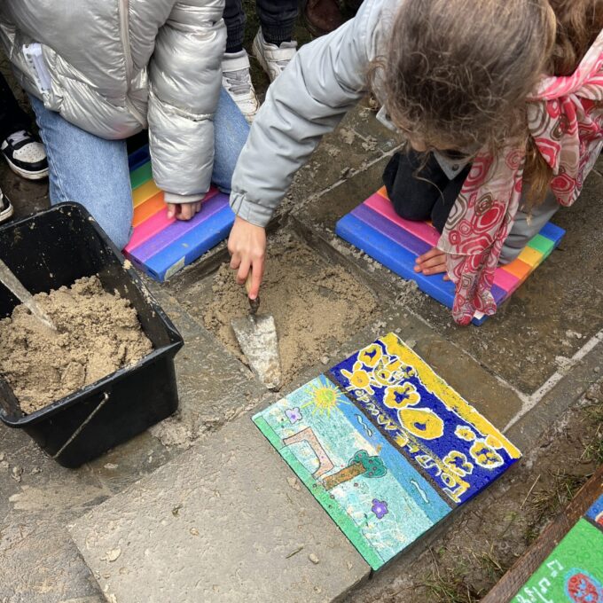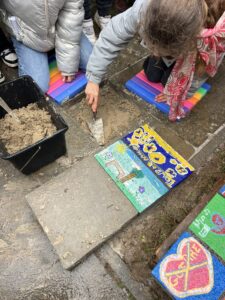 Au fil des ateliers, naît peu à peu l’idée de réaliser des dalles artistiques originales symbolisant la paix. Une trace de l’engagement de personnes de tous âges, des enfants de deuxième maternelle jusqu’aux adultes de près de quatre-vingts ans qui se sont penchées sur la question de la paix.