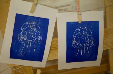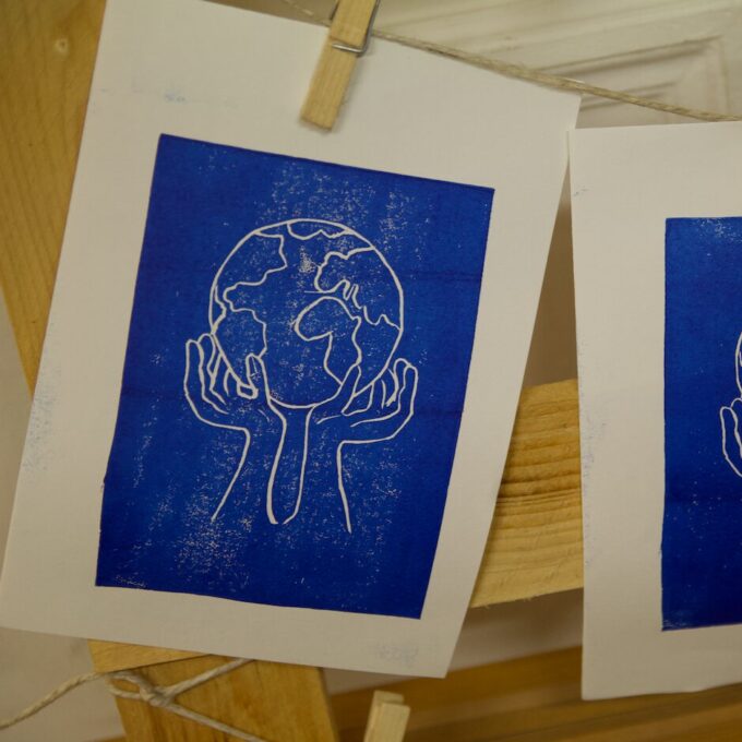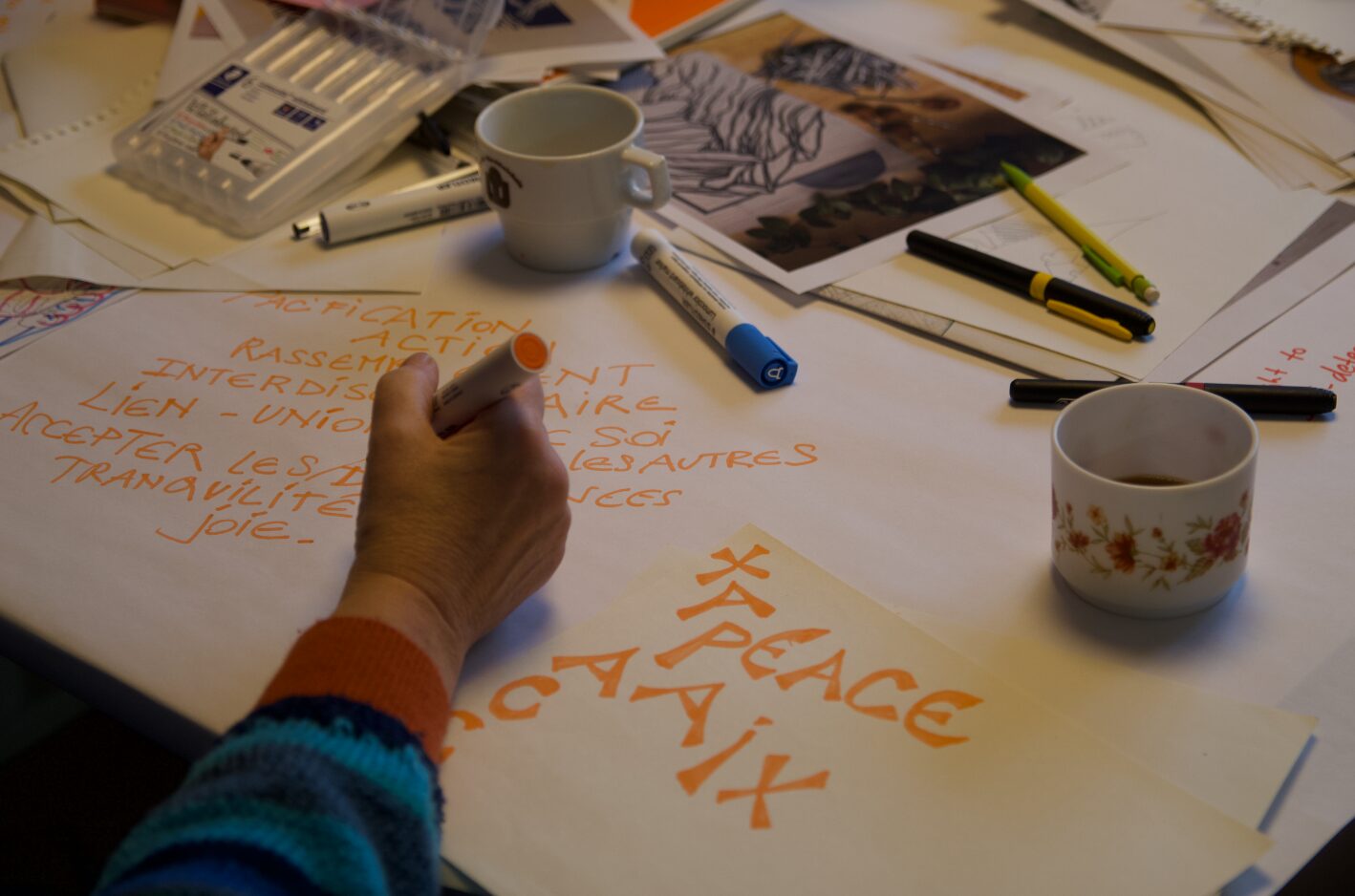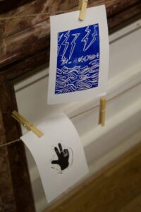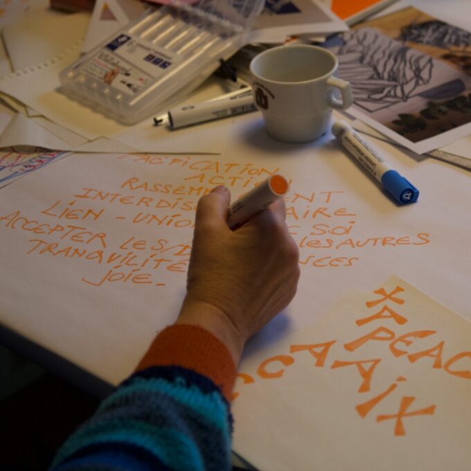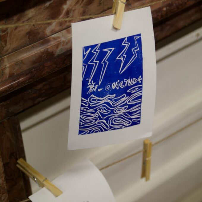 En parallèle, un Manteau de la paix se brode au fil d’ateliers et l’artiste Lara Pérez Dueñas, accueillie en résidence, se lance dans un projet d’étendards, un Manifeste pour une paix enragée, mêlant linogravure et broderie.